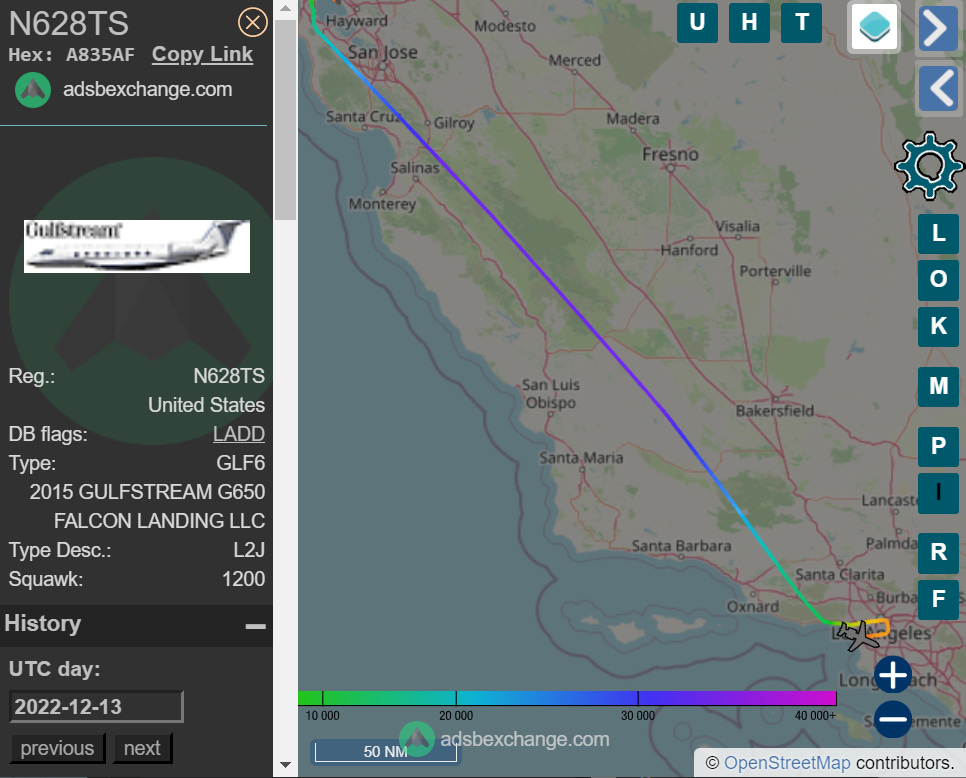 If you know the plane’s identifier (the thing printed in big letters on its side), you can track the plane live on these sites. We know N628TS is Elon Musk’s private jet, so we can look for it on sites like ADSBexchange.com. Some sites like FlightAware.com will remove such tracking at the request of an airplane owner, for privacy. Some won’t.