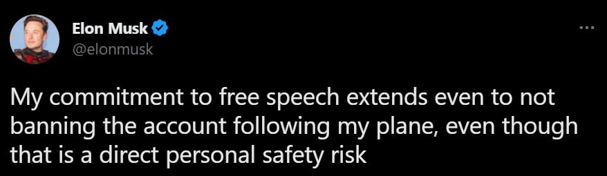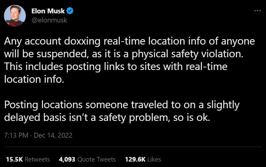 But on the other hand, it’s obvious we aren’t coming up with a neutral principle here. It’s just Musk working backwards. It’s a pretense that this would ever be the rule at Twitter if it weren’t Musk’s own jet involved.
