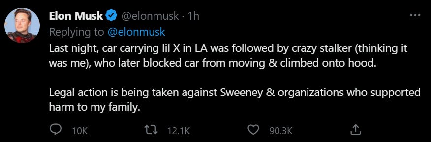 Apparently, this was due to an incident where a stalker went after his kid named “X AE A-XII”, though affectionately known as “lil X”. Presumably, Musk is somehow connecting this event with the ADS-B tracking from the previous day.